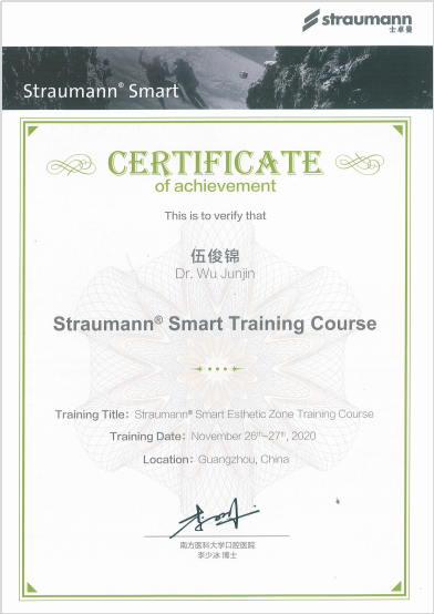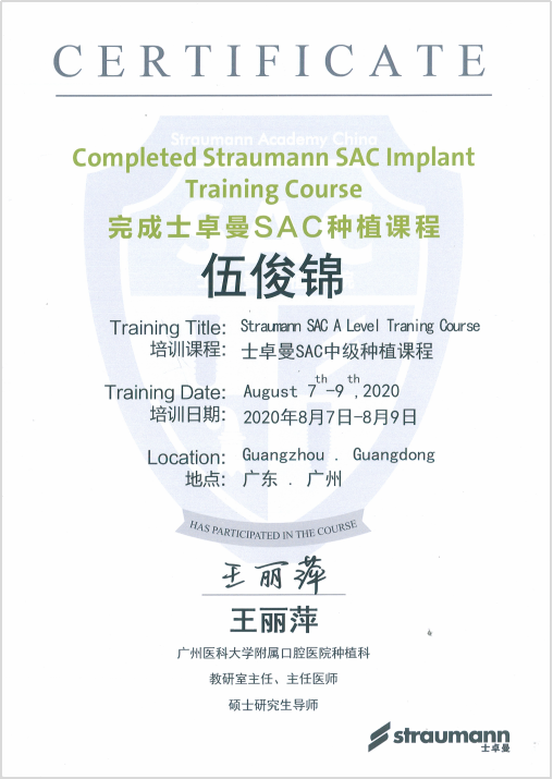 伍俊錦醫(yī)生,畢業(yè)于長沙醫(yī)學(xué)院口腔醫(yī)學(xué)專業(yè),曾在佛山市暨南大學(xué)附屬口腔醫(yī)院口腔科實(shí)習(xí),師從南方醫(yī)科大學(xué)口腔醫(yī)院種植科李少冰博士。曾參加北京口腔種植培訓(xùn)學(xué)院(BITC)教育周培訓(xùn),士卓曼種植大師之路培訓(xùn)并完成士卓曼SAC種植課程,以及口腔顯微根管治療四手操作培訓(xùn)并完成系統(tǒng)規(guī)范化課程及實(shí)踐操作。多次受邀參加國內(nèi)大型專業(yè)種植論壇會議,如第二屆粵港澳大灣區(qū)種植論壇暨第七次BITC口腔種植青年學(xué)者論壇、暨南大學(xué)口腔種植修復(fù)論壇等。